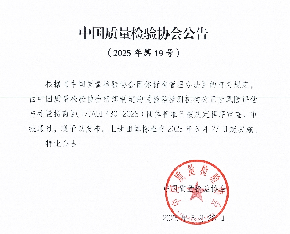 根据中国质量检验协会发布的2025年第19号公告,我院主导制定的《检验检测机构公正性风险评估与处置指南》(T/CAQI 430—2025)团体标准已按规定程序审查、审批通过,于2025年5月28日发布,并自2025年6月27日起实施。