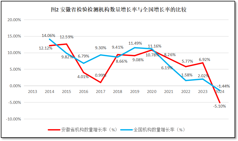 安徽省检验检测机构数量增长率与全国检验检测机构数量的增长率进行比较,结果如图2所示。